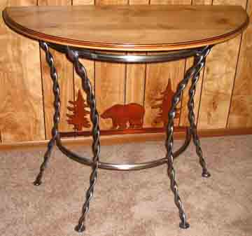 Half Moon Twisted Steel Table * Knotty alder wood top * *Rusted bear and pine cut out * * 37 3/4" wide x 32" high * *Limited Edition* * $425.00 *