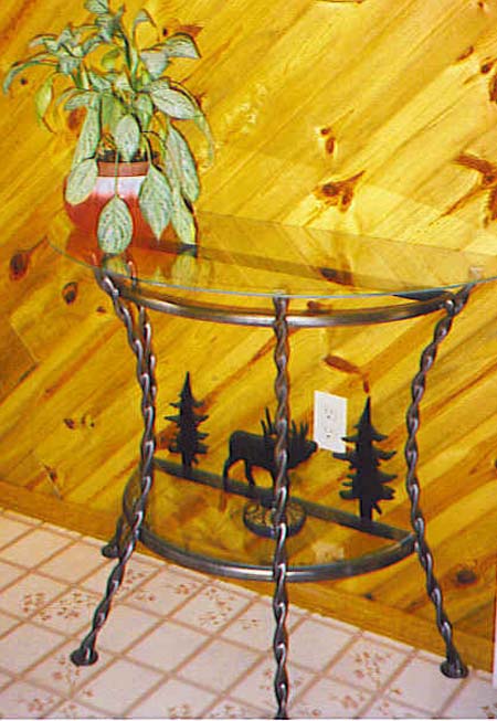 Half Moon Twisted Steel Table * Glass top and glass shelf * *Elk and pine tree black gloss cut out * *Twisted metal is a limited edition option on custom orders * * SOLD *