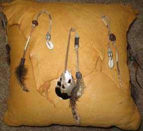 14" Tan Buck Skin Leather Ragged Flap Pillow decorated with Leather Lacing, Shells, Beads and Feathers $55.00