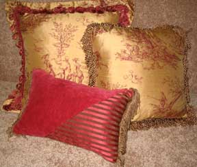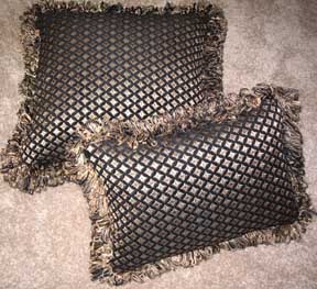 Set of Three Silk Toile Designer Pillows-21" Flange Down Pillow with Tassel Trim. Silk Toile on both sides. 16" Silk Toile on front with Rouge Velvet back (shown on rectangle pillow) and Twisted Bullion Fringe. Polyester pillow form. 16" x 11" Rectangle Multi-Fabric Pillow with Silk Toile on one side and Rouge Velvet and coordinating stripe on back (shown) with Gold Twist Fringe. $160.00/set of three Set of Two Black, Gold and Bronze Designer Pillows. Gorgeous Rayon blend. 16" Square Pillow with matching Tri-color Loop Fringe. 15" x 10" Rectangle Pillow with matching Tri-color Loop Fringe $68.00/Set