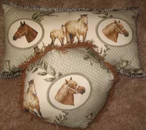 Set of Two Equestrian Pillows in Cream, Sage and Browns. 14" Stack Pillow with Pale Sage Faux Suede Back and Brown Faux Suede Fringe. 24" x 12" Rectangle Pillow also with Pale Sage Faux Suede Back and Sage Loop Fringe $60.00