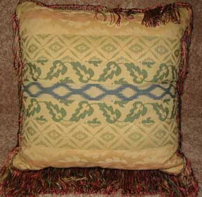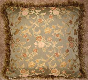 18" Vintage Design Pillow in Gold and Green with a touch of Blue and Pink. Pink Shell Satin Back with Gorgeous 4" Tri-color Loop Fringe to Complete the Vintage Appeal.