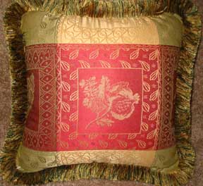 13" Pomegranate Color-block Sateen Pillow in Pale Lime Green, Red tones and Gold with Coordinating Tri-color Fringe. $30.00