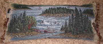 22" x 10" Inland Passage Rectangle Pillow featuring Orca, Fishing Boat, Seals, Sea Gulls and Wonderful Coastline Scenes Tapestry on both sides. Trimmed with Tan Fringe on Ends. $25.00