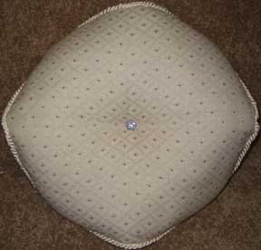 16" White Diamond Design Stack Pillow with Hints of Pink and Blue with Solid Blue Back and Braided Cording Trim. Accented in the Center with Vintage Flower Buttons. $20.00