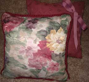Set of Two Designer Pillows Highlighting Rose Tones. 14" Rose Shell Design with Decorative Bow. 13" Floral Design with Matching Braided Cording $40.00/Set
