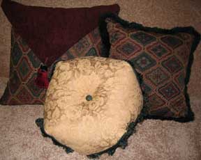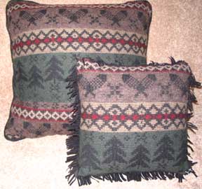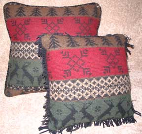 Set of Three Exquisite Tapestry Pillows in Hunter Green, Deep Burgundy and Gold. 21" Envelope Pillow with Burgundy Chenille Back and Envelope Flap Accented by a 4" Burgundy Tassel. 17" Square Pillow with Dk. Green Fringe. 13" Tapestry and Gold Rose Brocade Stack Pillow with Scalloped Dk. Green Loop Trim Accented with Decorative Buttons. $145.00/Set Set of Two Pendleton Style Wool Lodge Pillows in Forest Green, Deep Red, Black and Brown Tones. 22" Wool Pillow Featuring Pine Trees and Snow Shoes, Trimmed in Fine Black Cording. 14" Matching Wool Pillow with Black Faux Suede Back and 2" Black Faux Suede Fringe. $100.00/Set Set of Two Pendleton Style Wool Lodge Pillows in Bright Red, Brown, Cream, Green and Black Designs. 18" Wool Pillow with Both Sides featuring Pine Trees, Snow Flakes and Bucks with Black Braided Cording. 14" Matching Wool Pillow with 2" Black Faux Suede Fringe. $90.00