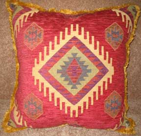 27" Southwestern Design Chenille Floor Pillow in Bright Peach, Yellows, Lavender, Blues and Pale Lime Green, accented with Gold Fringe. $75.00